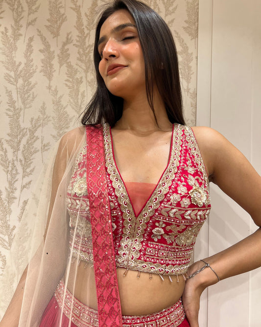 Scarlet Elegance: Applique Work Crop Top Skirt With Net Dupatta